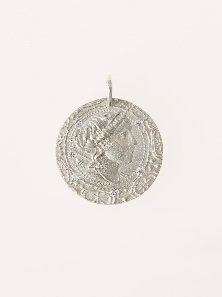 Un charm pièce en argent inspiré d'Artémis, la déesse de la lune. De luxueux diamants parsemés symbolisent le ciel étoilé qui illumine la lune. Déesse protectrice des forêts, des collines et des animaux sauvages, et supervisant la chasse, ce charm est parfait pour ceux qui recherchent force et grâce. (Veuillez noter que le charm pièce est vendu seul. Les chaînes sont vendues séparément et vous pouvez choisir parmi six modèles. Cependant, en raison de sa taille, nous recommandons de l'associer à une chaîne en argent.)