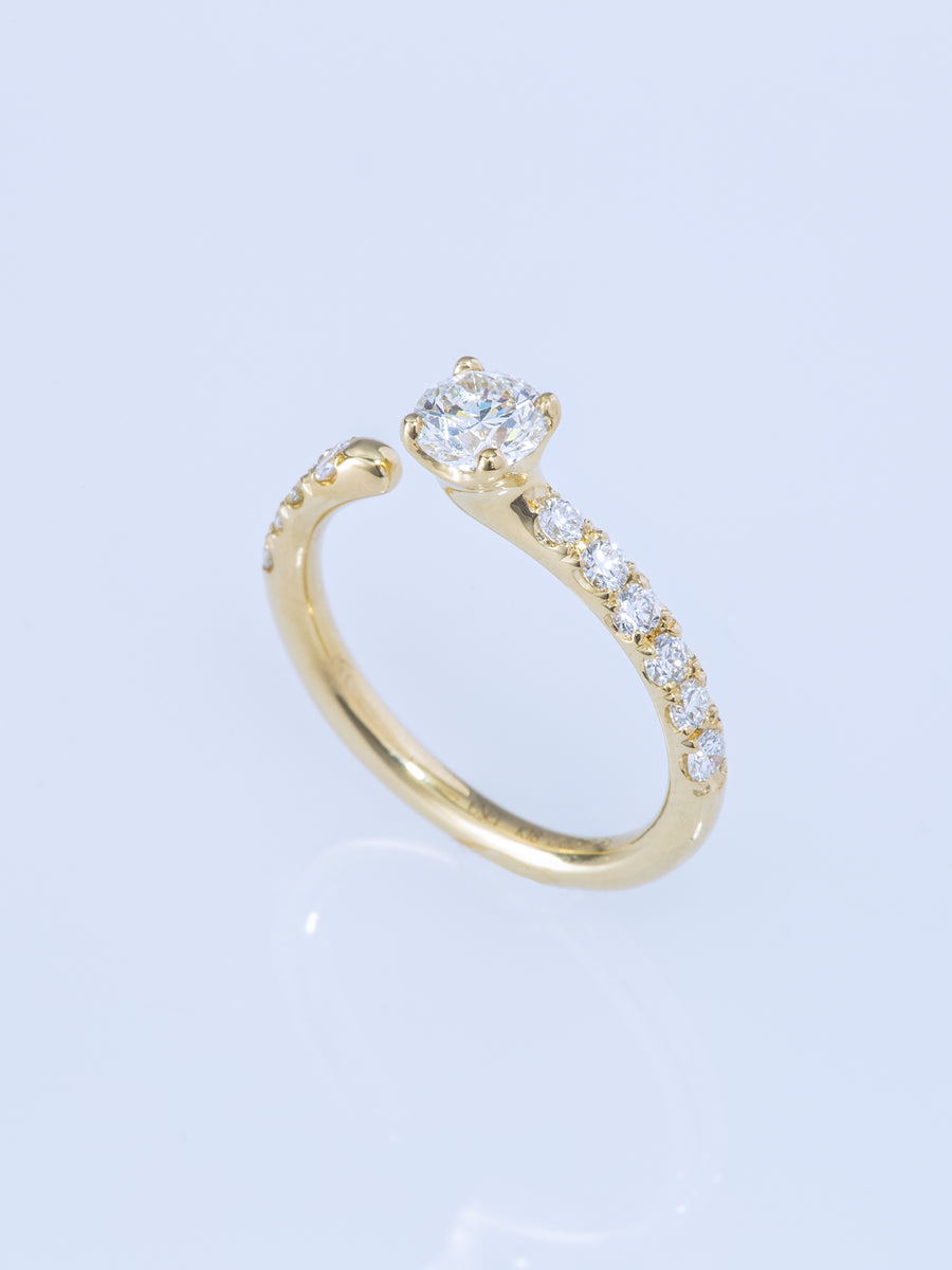 Célébration de la brillance et de l'équilibre, la bague « ONE » arbore en son centre un imposant diamant rond de synthèse d'environ 0,5 ct, associé à un élégant anneau semi-éternité de dix diamants brillants mêlés. Si l'audacieuse pierre centrale évoque une élégance intemporelle, le design ouvert apporte mouvement et modernité.