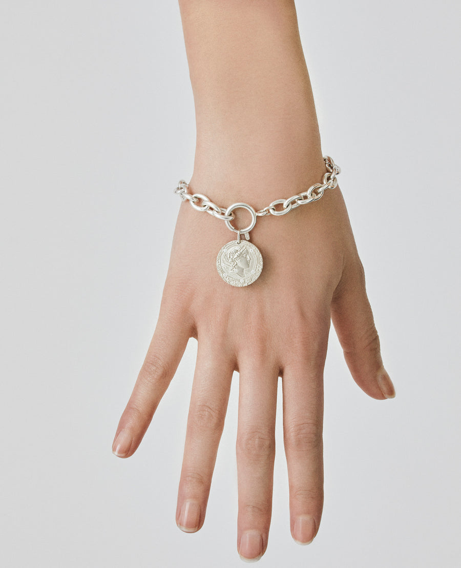 存在感のあるシルバーチェーンが手首にエッジを効かせ、スタイリッシュな印象に。コインチャームと合わせてボリューム感のある手首を演出してみてはいかがでしょうか。(本商品はチェーンのみとなります。)