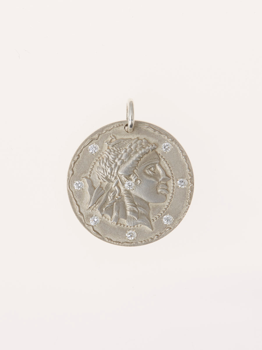 太陽神アポロンのシルバーコインチャーム。中央から放射状に輝くラボグロウンダイヤモンドは、太陽の輝きを象徴しています。光と芸術、音楽の神アポロンは、才能を育み、明るい未来を掴みたい方におすすめです。(コインはチャームのみの販売です。チェーンは6種類ありますが、シルバーコインチャームはサイズが大きいため、シルバーチェーンとの併用がおすすめです。)