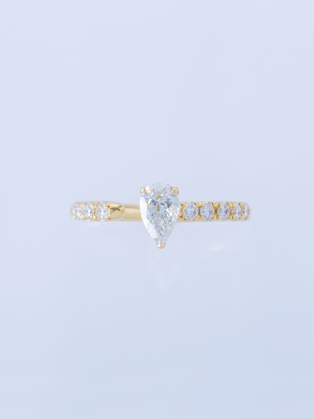 洗練されたラグジュアリーを体感できる「ONE」リング。約0.5カラットのペアシェイプのラボグロウンダイヤモンドをセンターピースにあしらい、10石のきらめくメレダイヤモンドを優美にあしらったハーフエタニティリングが美しく調和しています。オープンエンドのデザインが軽やかさと流れるような印象を与え、わずかに盛り上がったセッティングがメインダイヤモンドを高く持ち上げ、輝きと存在感を高めています。