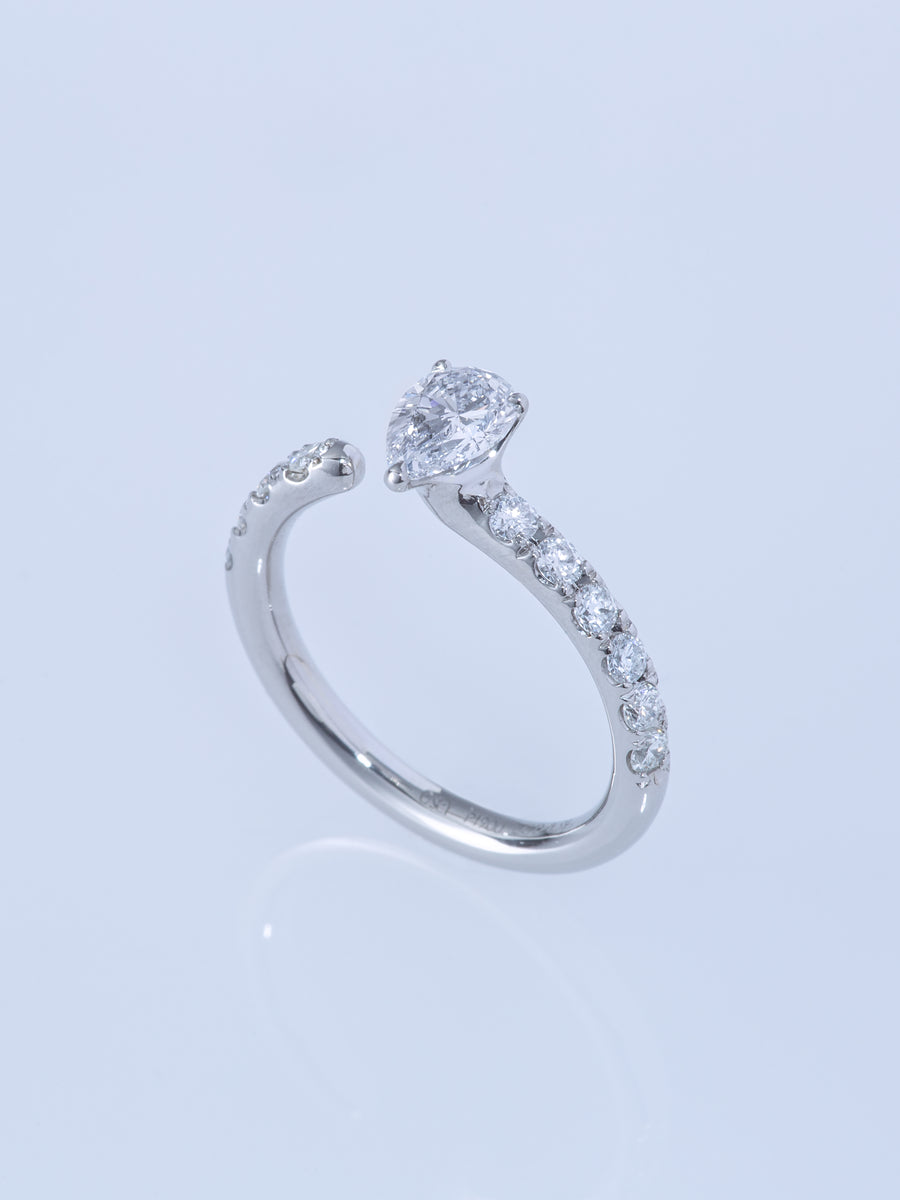 洗練されたエレガンスを体現する「ONE」リングは、約0.5カラットのペアシェイプのラボグロウンダイヤモンドを中央に配し、優美なハーフエタニティセッティングで10石のきらめくメレダイヤモンドがアクセントを添えています。オープンエンドのシルエットが動きと軽やかさを添え、わずかに盛り上がったセッティングがセンターストーンの視覚的なインパクトを高め、あらゆる角度から視線を惹きつけます。