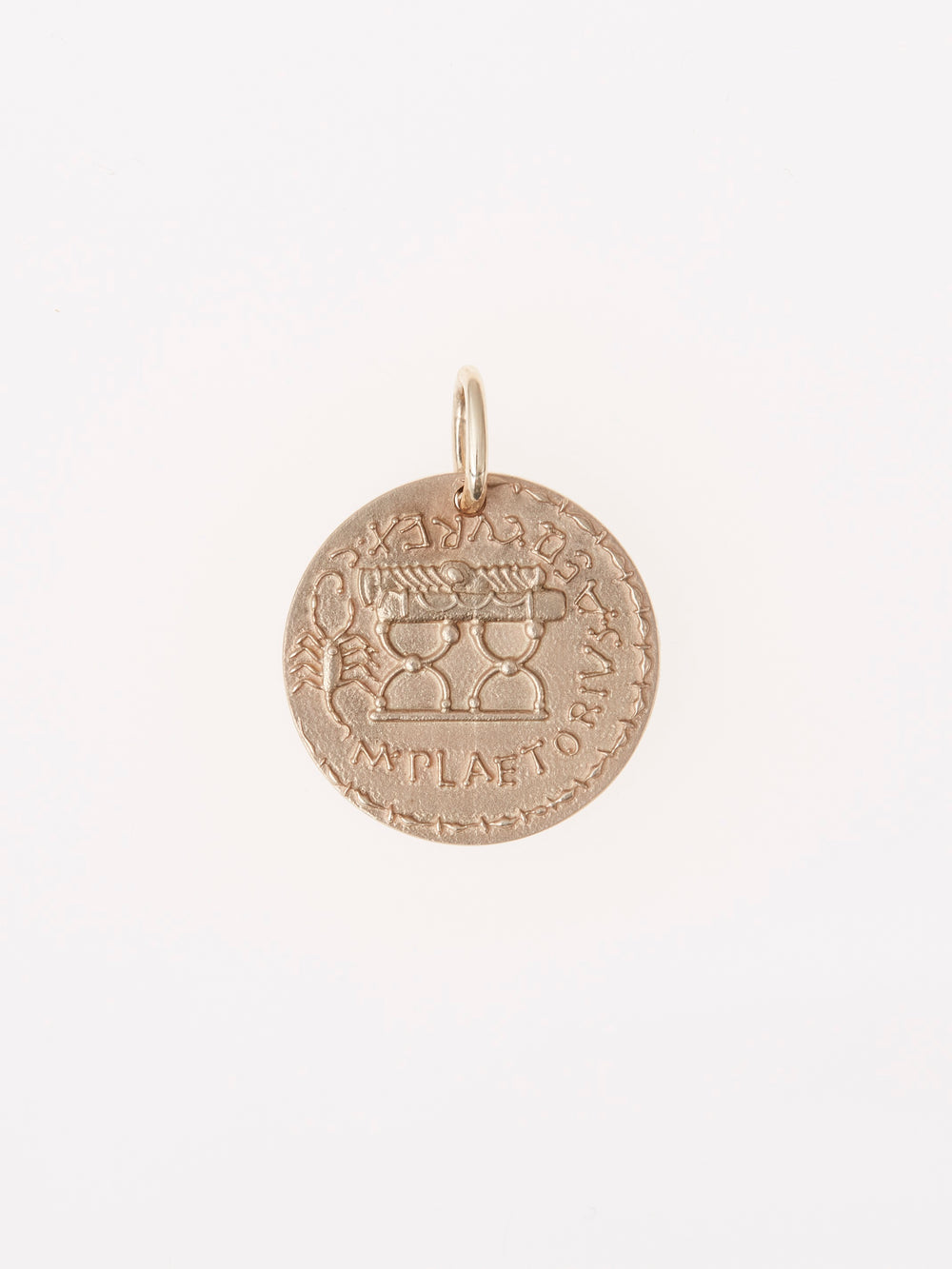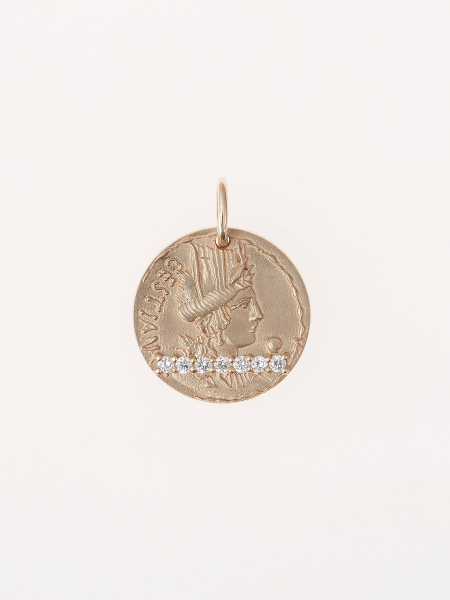A 10K coin charm inspired by Cybele, the Great Mother Goddess. The luxuriously arranged diamonds symbolize the horizon of the earth. Cybele, the goddess of fertility and abundance, embodies the richness of the earth. Also regarded as the protector of knowledge, she is the perfect symbol for those seeking an intellectual and magnanimous heart. (The coin is sold as a charm only. You can choose from six types of chains, each sold separately.)